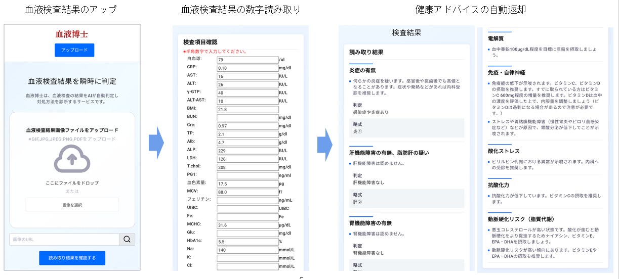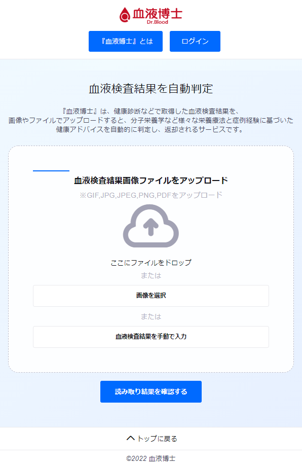 - 『血液博士』とは、健康診断などで取得した血液検査結果を、画像やファイルでアップロードすると、分子栄養学(※)など様々な栄養療法と症例経験に基づいた健康アドバイスを自動的に判定し、返却されるサービスです。